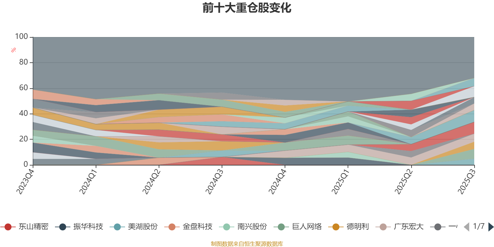 截至2025年三季度末,基金十大重仓股分别是杰普特、协创数据、新泉股份、巨人网络、长盈精密、广东宏大、德明利、寒武纪、华丰科技、美湖股份。