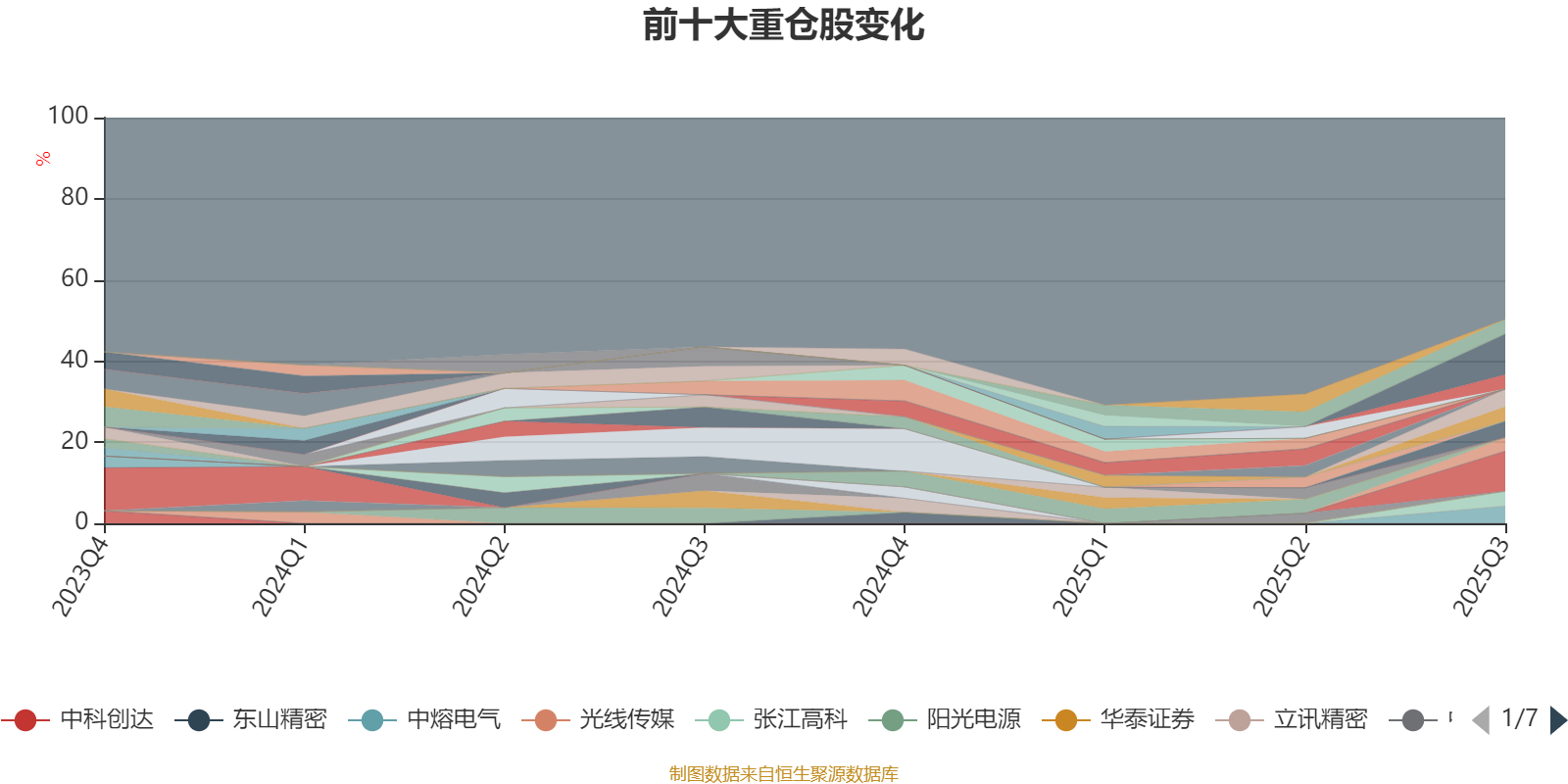 截至2025年三季度末,基金十大重仓股分别是新易盛、中际旭创、同花顺、中熔电气、东方财富、张江高科、移远通信、华海清科、拓荆科技、中微公司。