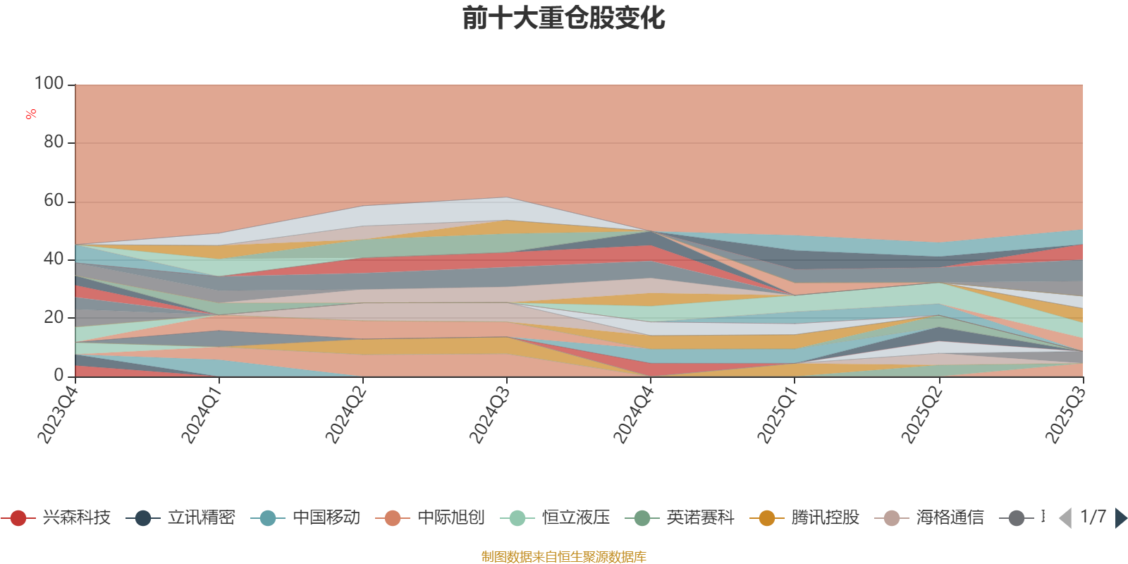 截至2025年三季度末,基金十大重仓股分别是九方智投控股、小米集团-W、蓝思科技、金蝶国际、兆易创新、FIT HON TENG、金山云、中际旭创、腾景科技、联想集团。