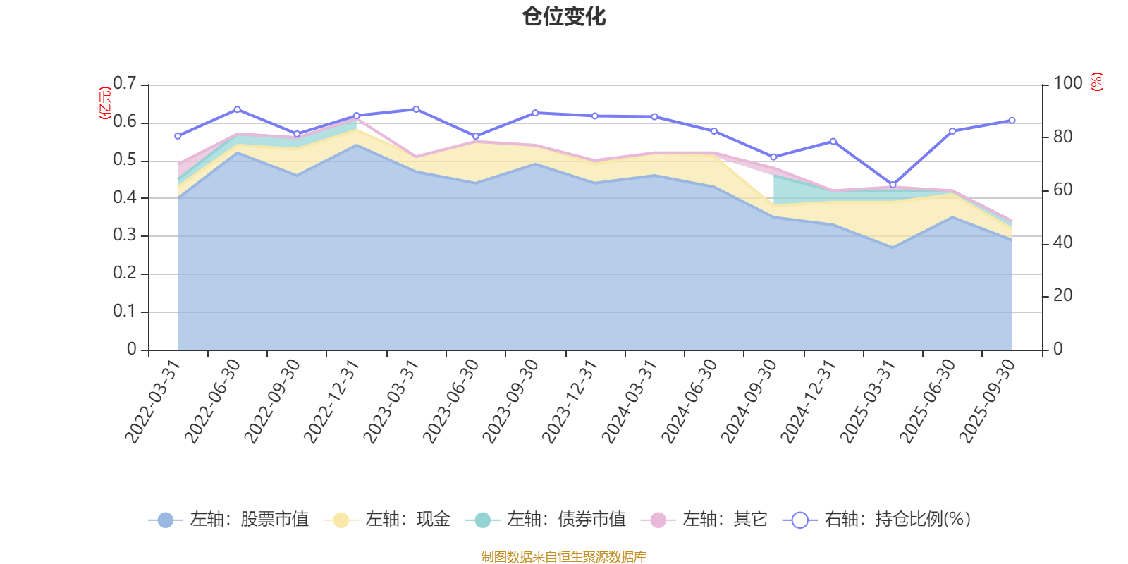 据定期报告数据统计,近三年平均股票仓位为82.51%,同类平均为83.73%。2023年一季度末基金达到90.71%的最高仓位,2025年一季度末最低,为62.27%。