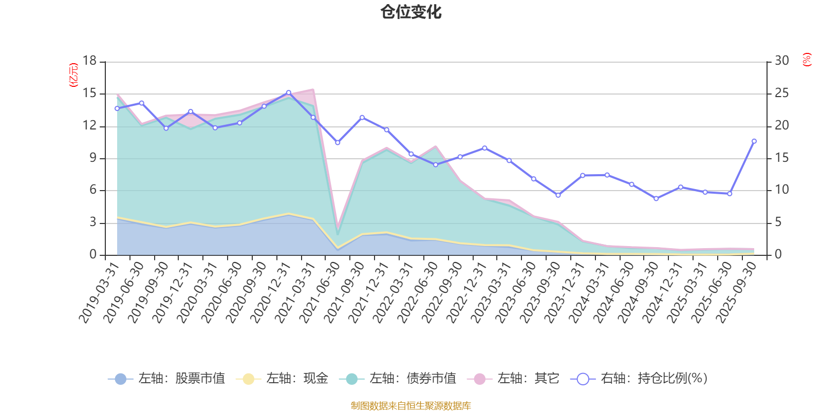 据定期报告数据统计,近三年平均股票仓位为12.03%,同类平均为72.35%。2020年末基金达到25.21%的最高仓位,2024年三季度末最低,为8.77%。