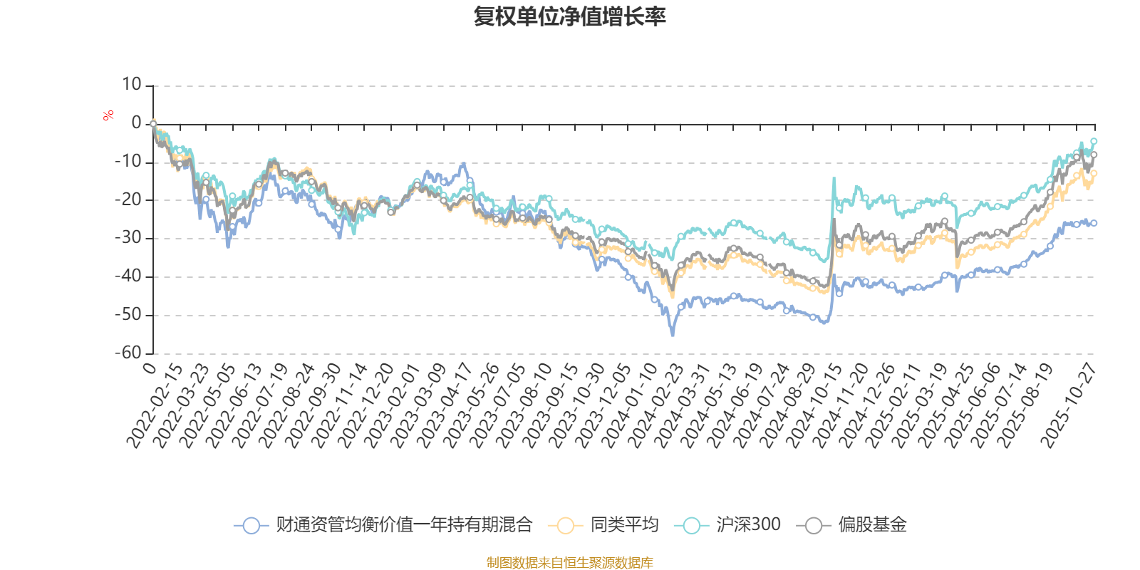 截至10月27日,财通资管均衡价值一年持有期混合近三个月复权单位净值增长率为10.85%,位于同类可比基金132/185;近半年复权单位净值增长率为22.36%,位于同类可比基金129/185;近一年复权单位净值增长率为26.89%,位于同类可比基金96/181;近三年复权单位净值增长率为-4.17%,位于同类可比基金152/175。