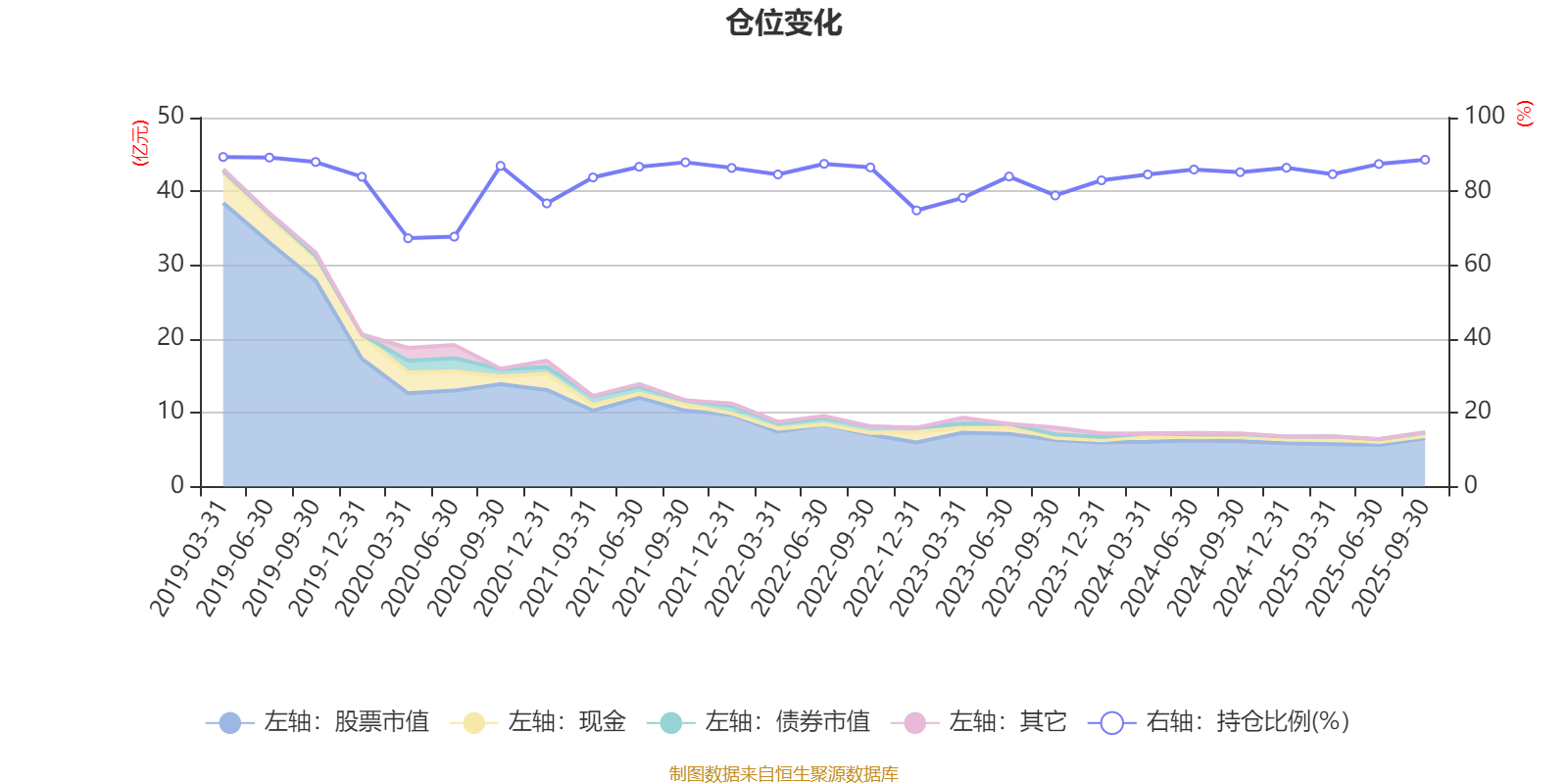 据定期报告数据统计,近三年平均股票仓位为83.49%,同类平均为85.99%。2019年一季度末基金达到89.33%的最高仓位,2020年一季度末最低,为67.3%。