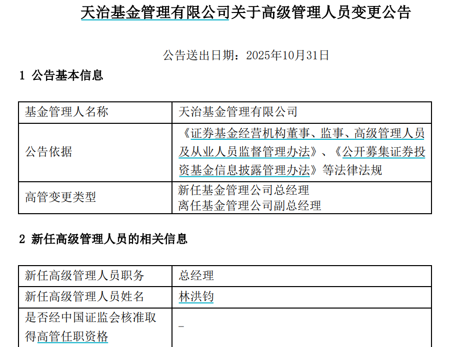 10月31日,天治基金发布高级管理人员变更公告,宣布公司管理层迎来重要调整:林洪钧因工作调整离任公司副总经理职务,同时升任公司总经理,任职日期与离任日期均为2025年10月31日。此外,公告还提及,自同日起,柴晓秀女士不再代为履行总经理职务。上述变更事项已通过天治基金董事会审议,并将按规定履行相应备案手续。