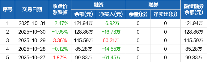 融资方面,当日融资买入52.04万元,融资偿还58.95万元,融资净偿还6.92万元。融券方面,融券卖出0份,融券偿还0份,融券余量0份,融券余额0元。融资融券余额合计121.94万元。