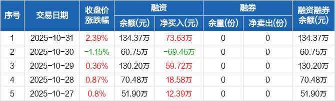 融资方面,当日融资买入219.27万元,融资偿还145.64万元,融资净买入73.63万元。融券方面,融券卖出0份,融券偿还0份,融券余量0份,融券余额0元。融资融券余额合计134.37万元。