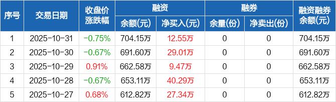 融资方面,当日融资买入92.97万元,融资偿还80.42万元,融资净买入12.55万元,连续5日净买入累计118.67万元。融券方面,融券卖出0份,融券偿还0份,融券余量0份,融券余额0元。融资融券余额合计704.15万元。