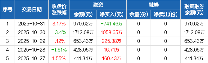 融资方面,当日融资买入369.23万元,融资偿还1110.69万元,融资净偿还741.46万元。融券方面,融券卖出0份,融券偿还0份,融券余量0份,融券余额0元。融资融券余额合计970.62万元。