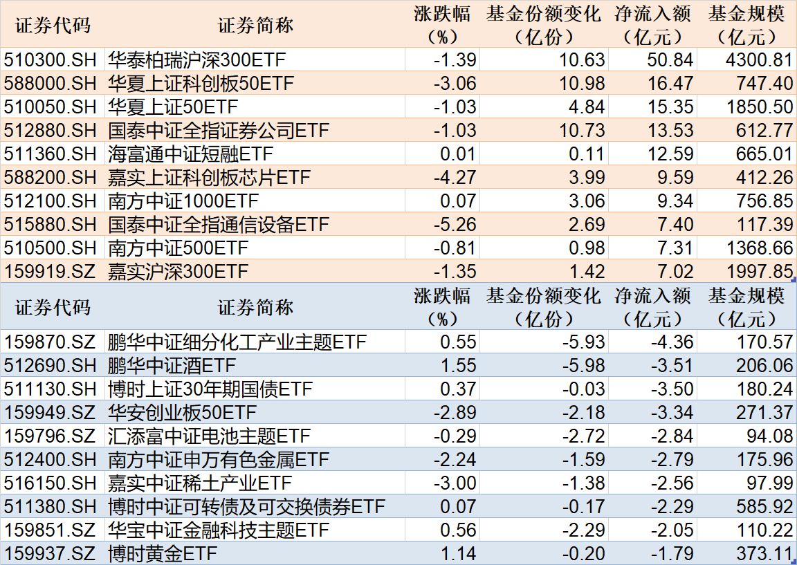 ETF规模速报 | 沪深300ETF净流入超50亿元,化工ETF净流出超4亿元