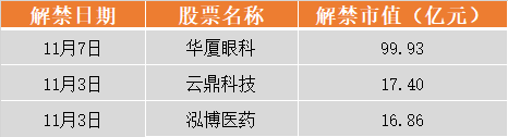 具体来看,华厦眼科11月7日将解禁5.11亿股,为首发原股东限售股份;云鼎科技11月3日将解禁1.53亿股,为定向增发机构配售股份;泓博医药11月3日将解禁0.49亿股,为首发原股东限售股份。
