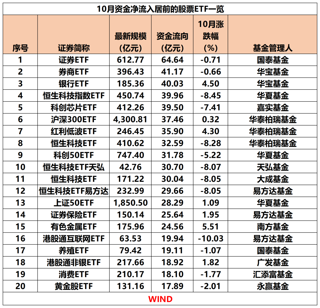 具体来看,10月份证券ETF、券商ETF、银行ETF等热门主题ETF产品资金净流入居前,沪深300ETF、科创50ETF、上证50ETF等宽基ETF产品也成为“吸金”主力。