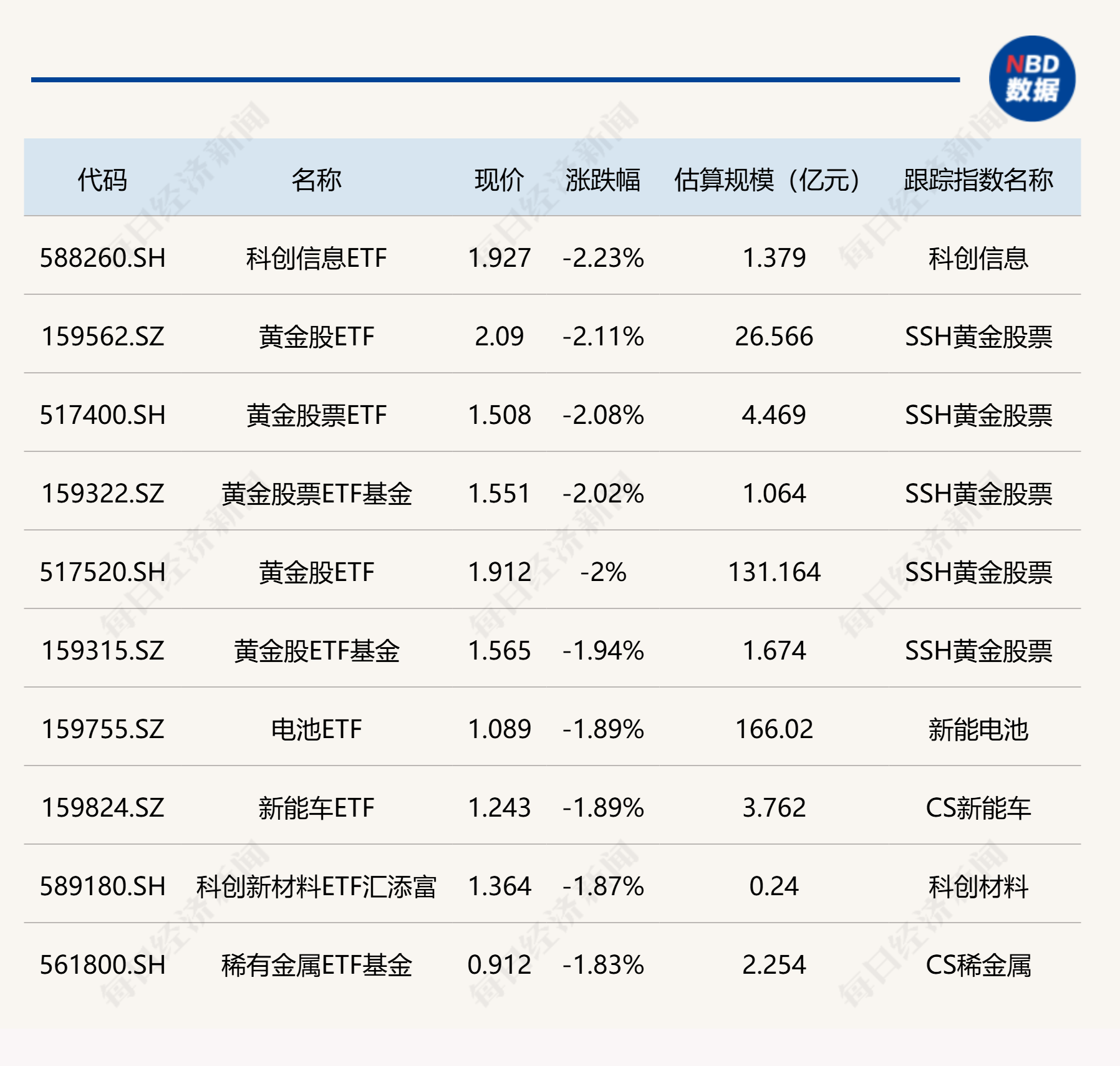 下跌方面,科创信息、黄金股相关ETF跌超2%。