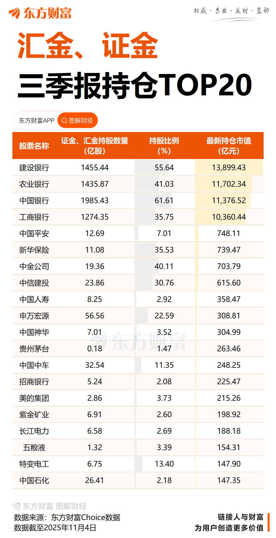 其中,中国银行、农业银行、工商银行是“国家队”资金三季度末持有市值最多的三只个股,分别持有1.03万亿元、9677.3亿元、9302.7亿元;持有中金公司、中国平安、新华保险、中信建投的市值也均在600亿元以上。