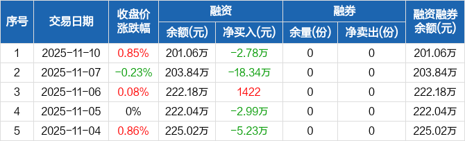 融资方面,当日融资买入1.08万元,融资偿还3.86万元,融资净偿还2.78万元。融券方面,融券卖出0份,融券偿还0份,融券余量0份,融券余额0元。融资融券余额合计201.06万元。