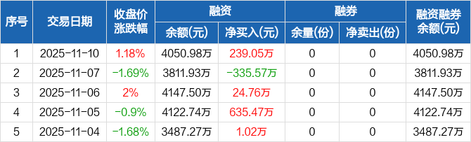 融资方面,当日融资买入851.32万元,融资偿还612.28万元,融资净买入239.05万元。融券方面,融券卖出0份,融券偿还0份,融券余量0份,融券余额0元。融资融券余额合计4050.98万元。