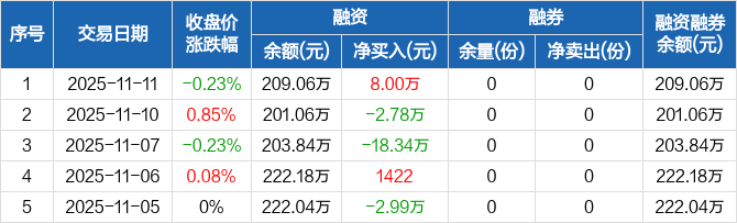 融资方面,当日融资买入9.79万元,融资偿还1.79万元,融资净买入8万元。融券方面,融券卖出0份,融券偿还0份,融券余量0份,融券余额0元。融资融券余额合计209.06万元。