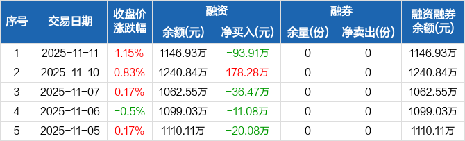 融资方面,当日融资买入229.6万元,融资偿还323.51万元,融资净偿还93.91万元。融券方面,融券卖出0份,融券偿还0份,融券余量0份,融券余额0元。融资融券余额合计1146.93万元。