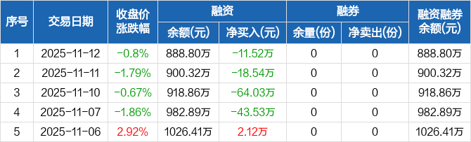 融资方面,当日融资买入175.7万元,融资偿还187.23万元,融资净偿还11.52万元,连续4日净偿还累计137.62万元。融券方面,融券卖出0份,融券偿还0份,融券余量0份,融券余额0元。融资融券余额合计888.8万元。