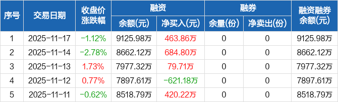融资方面,当日融资买入4537.04万元,融资偿还4073.18万元,融资净买入463.86万元,连续3日净买入累计1228.37万元。融券方面,融券卖出0份,融券偿还0份,融券余量0份,融券余额0元。融资融券余额合计9125.98万元。