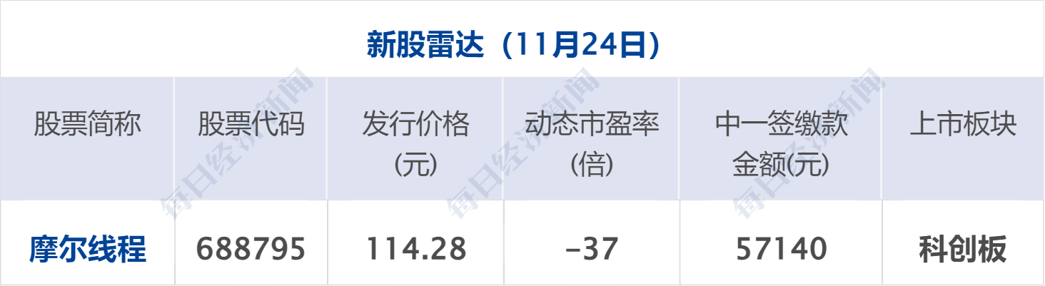摩尔线程:11月24日,国产GPU“第一股”摩尔线程新股申购。根据此前公告,公司本次发行股份数量为7000万股,发行价格为114.28元/股,预计募集资金总额为80亿元,扣除发行费用后,预计募集资金净额为75.76亿元。该股将在2025年11月24日进行网上和网下申购。值得注意的是,摩尔线程是今年以来发行价最高的新股,中一签需缴款57140元。摩尔线程本次发行后总股本为4.7亿股,按114.28元/股的发行价计算,上市时总市值将达537亿元。