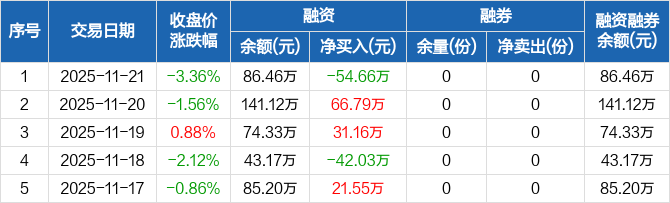 融资方面,当日融资买入73.26万元,融资偿还127.91万元,融资净偿还54.66万元。融券方面,融券卖出0份,融券偿还0份,融券余量0份,融券余额0元。融资融券余额合计86.46万元。