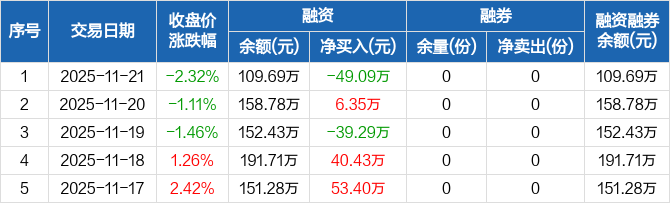 融资方面,当日融资买入43.39万元,融资偿还92.47万元,融资净偿还49.09万元。融券方面,融券卖出0份,融券偿还0份,融券余量0份,融券余额0元。融资融券余额合计109.69万元。
