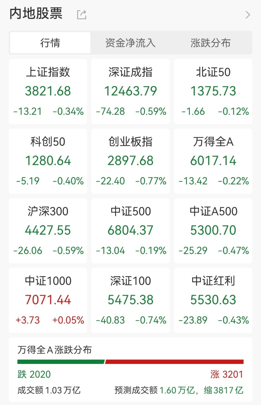 11月24日,A股市场早盘高开回落,三大指数集体翻绿,截至午盘,沪指跌0.34%,深成指跌0.59%,创业板指跌0.77%。沪深两市半日成交额1.03万亿,较上个交易日缩量3817亿。全市场超3200只个股上涨。