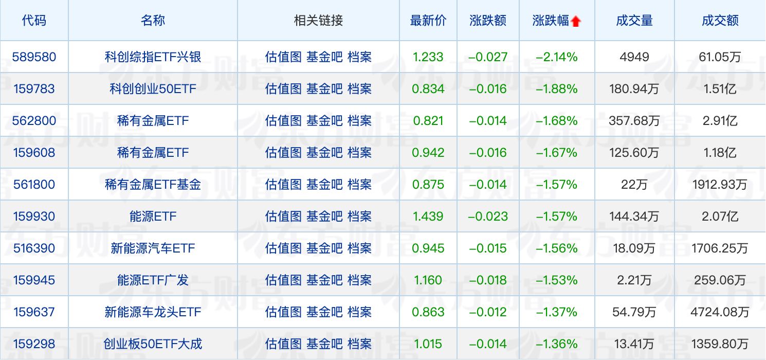 下跌方面,科创综指ETF兴银领跌2.14%,多只稀有金属ETF回调居前。