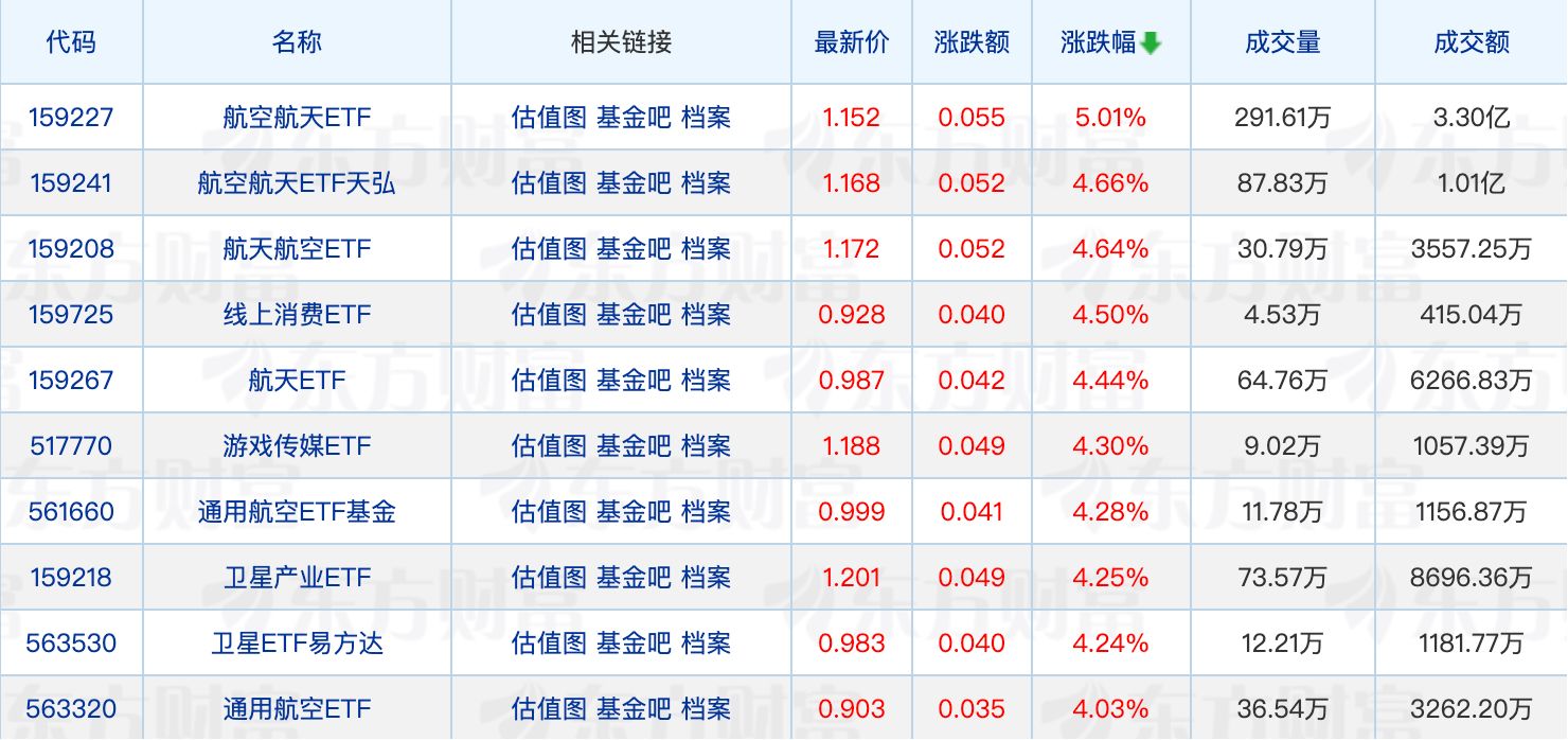 具体来看,商业航天概念持续拉升,航天发展等10股涨停,航空航天相关ETF集体走强,最高涨5.01%。