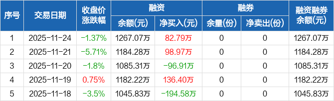 融资方面,当日融资买入526.25万元,融资偿还443.46万元,融资净买入82.79万元。融券方面,融券卖出0份,融券偿还0份,融券余量0份,融券余额0元。融资融券余额合计1267.07万元。