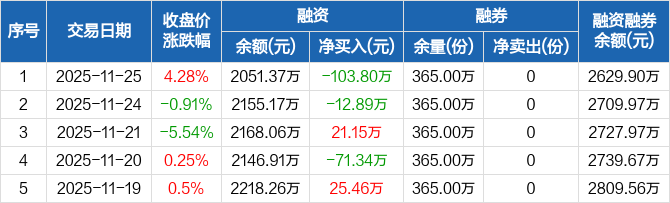 融资方面,当日融资买入412.41万元,融资偿还516.21万元,融资净偿还103.8万元。融券方面,融券卖出0份,融券偿还0份,融券余量365万份,融券余额578.53万元。融资融券余额合计2629.9万元。