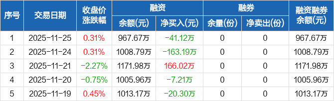 融资方面,当日融资买入88.73万元,融资偿还129.85万元,融资净偿还41.12万元。融券方面,融券卖出0份,融券偿还0份,融券余量0份,融券余额0元。融资融券余额合计967.67万元。