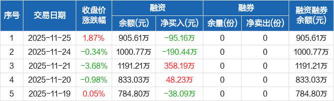 融资方面,当日融资买入294.89万元,融资偿还390.05万元,融资净偿还95.16万元。融券方面,融券卖出0份,融券偿还0份,融券余量0份,融券余额0元。融资融券余额合计905.61万元。