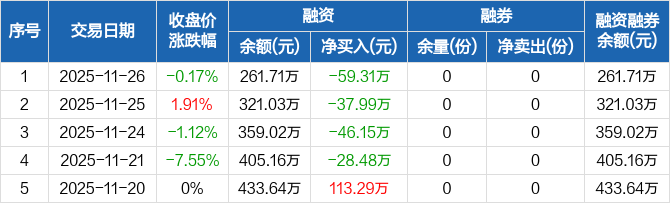 融资方面,当日融资买入185.14万元,融资偿还244.46万元,融资净偿还59.31万元,连续4日净偿还累计171.93万元。融券方面,融券卖出0份,融券偿还0份,融券余量0份,融券余额0元。融资融券余额合计261.71万元。