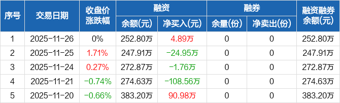融资方面,当日融资买入446.07万元,融资偿还441.18万元,融资净买入4.89万元。融券方面,融券卖出0份,融券偿还0份,融券余量0份,融券余额0元。融资融券余额合计252.8万元。