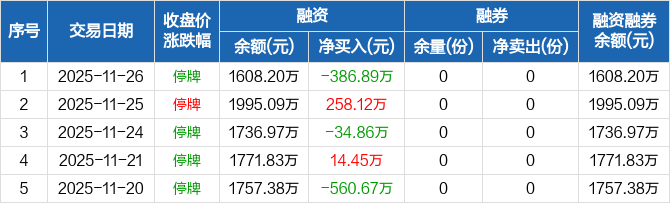 融资方面,当日融资买入203.13万元,融资偿还590.02万元,融资净偿还386.89万元。融券方面,融券卖出0份,融券偿还0份,融券余量0份,融券余额0元。融资融券余额合计1608.2万元。