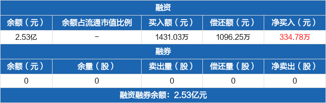 融资方面,当日融资买入1431.03万元,融资偿还1096.25万元,融资净买入334.78万元。融券方面,融券卖出0份,融券偿还0份,融券余量0份,融券余额0元。融资融券余额合计2.53亿元。