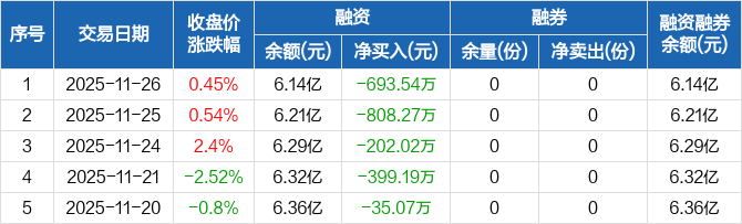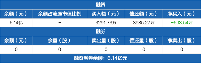 融资方面,当日融资买入3291.73万元,融资偿还3985.27万元,融资净偿还693.54万元,连续5日净偿还累计2138.09万元。融券方面,融券卖出0份,融券偿还0份,融券余量0份,融券余额0元。融资融券余额合计6.14亿元。
