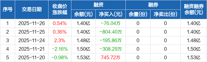 融资方面,当日融资买入819.34万元,融资偿还895.37万元,融资净偿还76.04万元,连续4日净偿还累计1384.58万元。融券方面,融券卖出0份,融券偿还0份,融券余量0份,融券余额0元。融资融券余额合计1.4亿元。