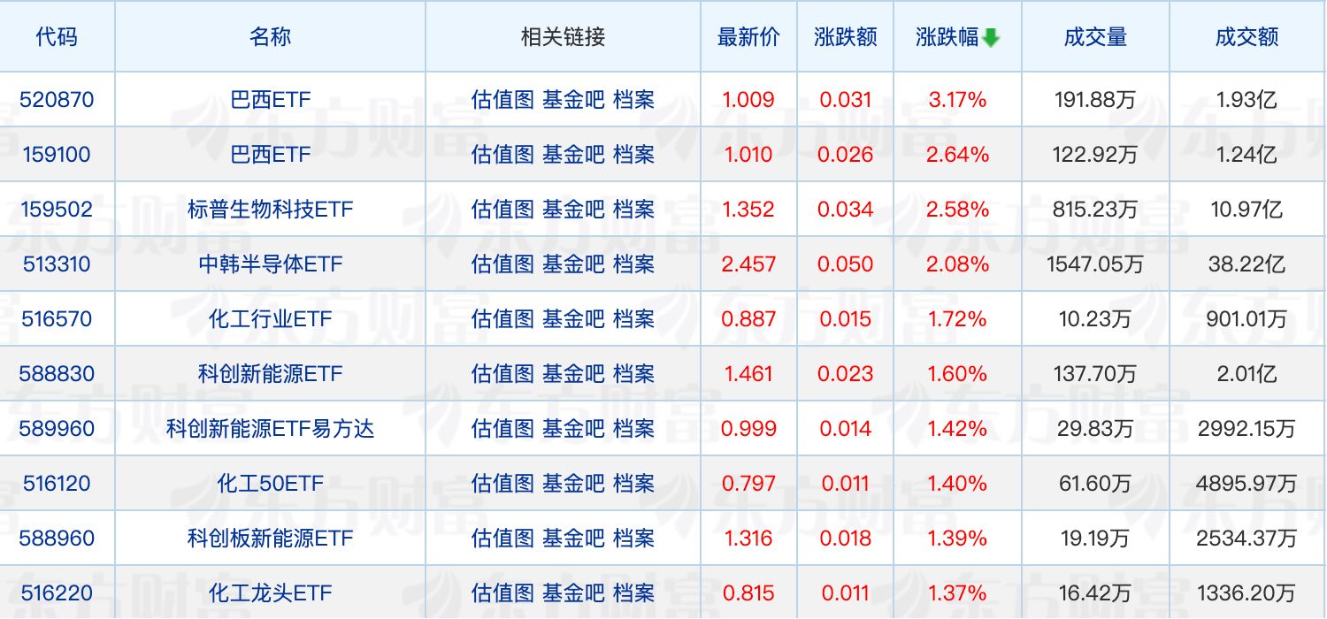 具体来看,两只巴西ETF领涨,最大涨幅为3.17%;此外,化工ETF也有所表现。