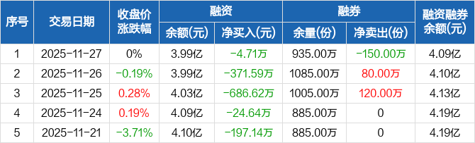 融资方面,当日融资买入2150.6万元,融资偿还2155.31万元,融资净偿还4.71万元,连续7日净偿还累计1586.12万元。融券方面,融券卖出50万份,融券偿还200万份,融券余量935万份,融券余额996.71万元。融资融券余额合计4.09亿元。