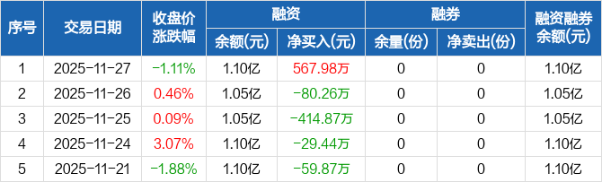 融资方面,当日融资买入2691.02万元,融资偿还2123.04万元,融资净买入567.98万元。融券方面,融券卖出0份,融券偿还0份,融券余量0份,融券余额0元。融资融券余额合计1.1亿元。