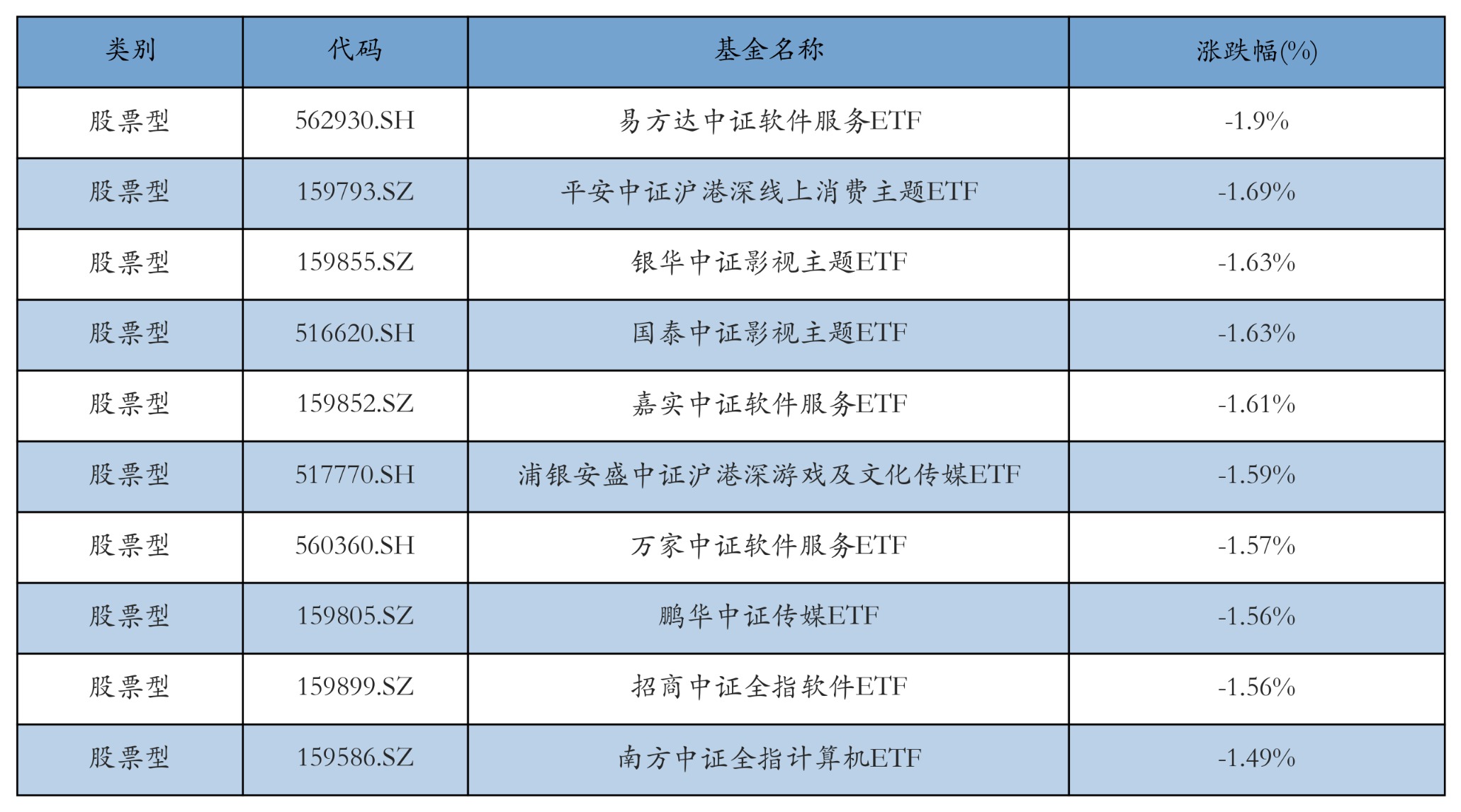昨日股票型ETF跌幅最大的3只ETF及其收益率分别为:易方达中证软件服务ETF(-1.9%)、平安中证沪港深线上消费主题ETF(-1.69%)、银华中证影视主题ETF(-1.63%)。跌幅前10详情见下表: