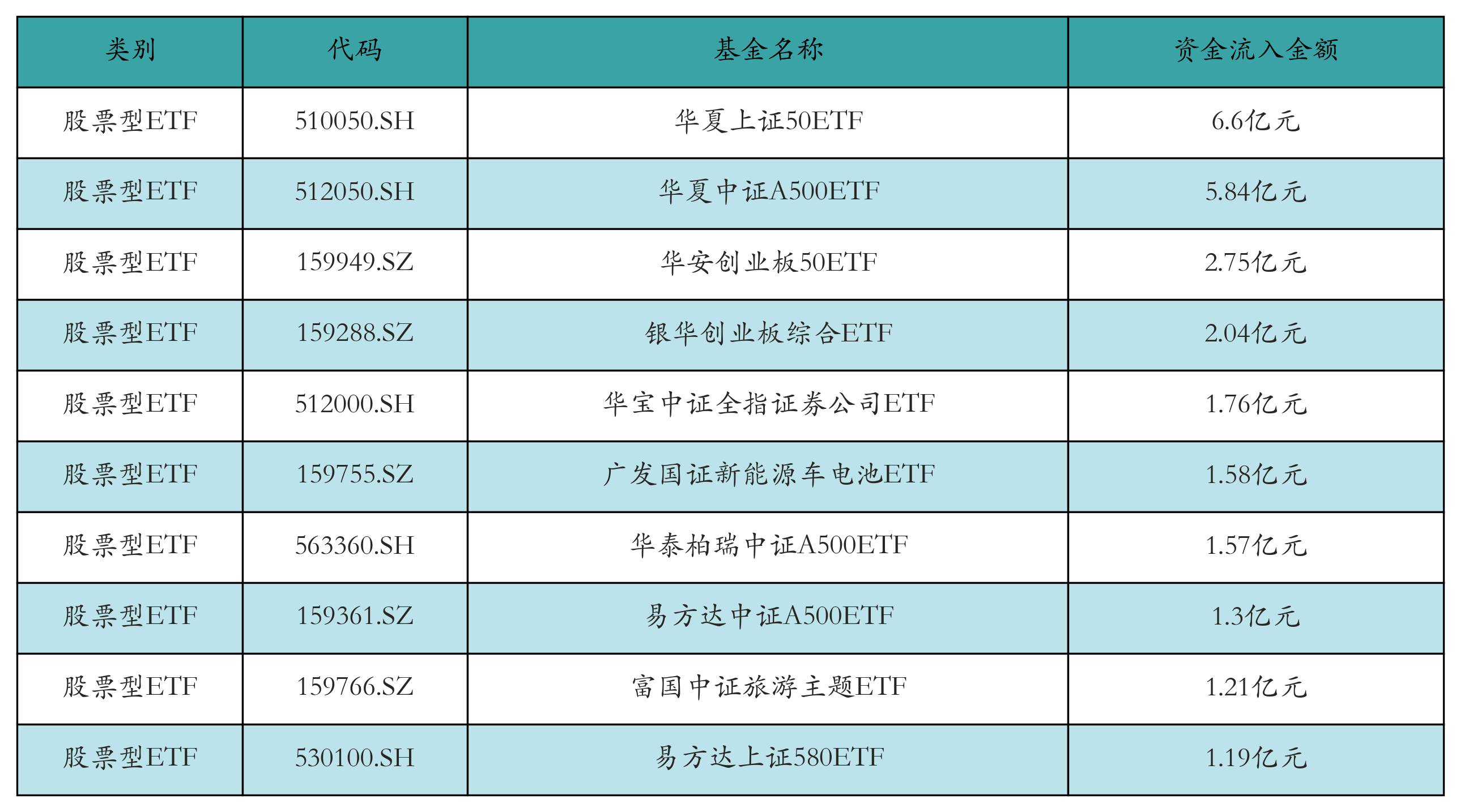 昨日股票型ETF资金流入最多的3只ETF及其流入金额分别为:华夏上证50ETF(流入6.6亿元)、华夏中证A500ETF(流入5.84亿元)、华安创业板50ETF(流入2.75亿元)。资金流入前10详情见下表: