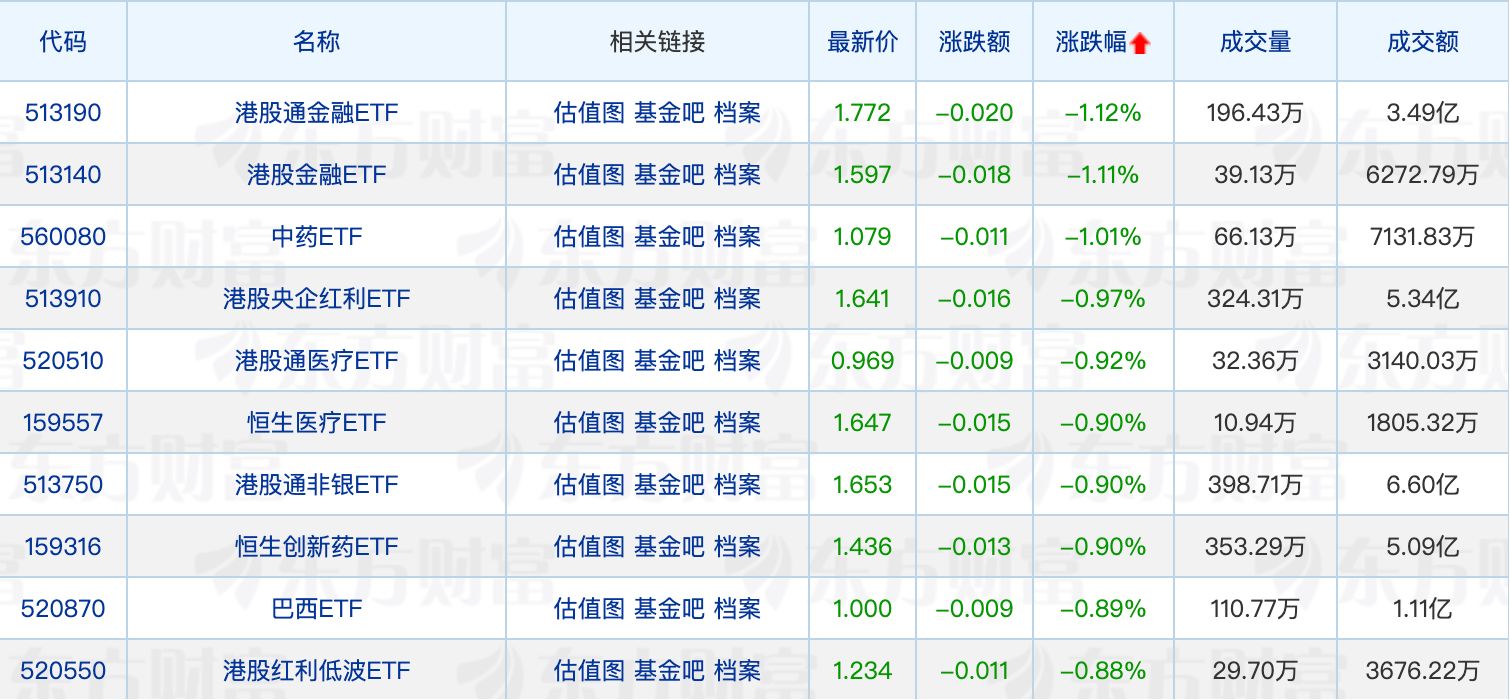 下跌方面,港股通金融ETF、港股金融ETF、中药ETF跌幅超过1%。