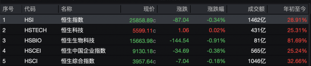 11月28日,恒生指数收跌0.34%,报25858.89点;恒生科技指数收涨0.02%,报5599.11点;恒生中国企业指数收跌0.38%,报9130.18点。全日大市成交额为1462亿港元,南向资金净买入27.27亿港元。