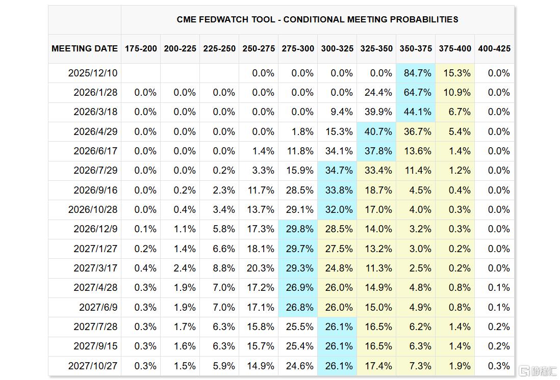 据CME“美联储观察”,美联储12月降息25个基点的概率已升至84.7%,维持利率不变的概率为15.3%。