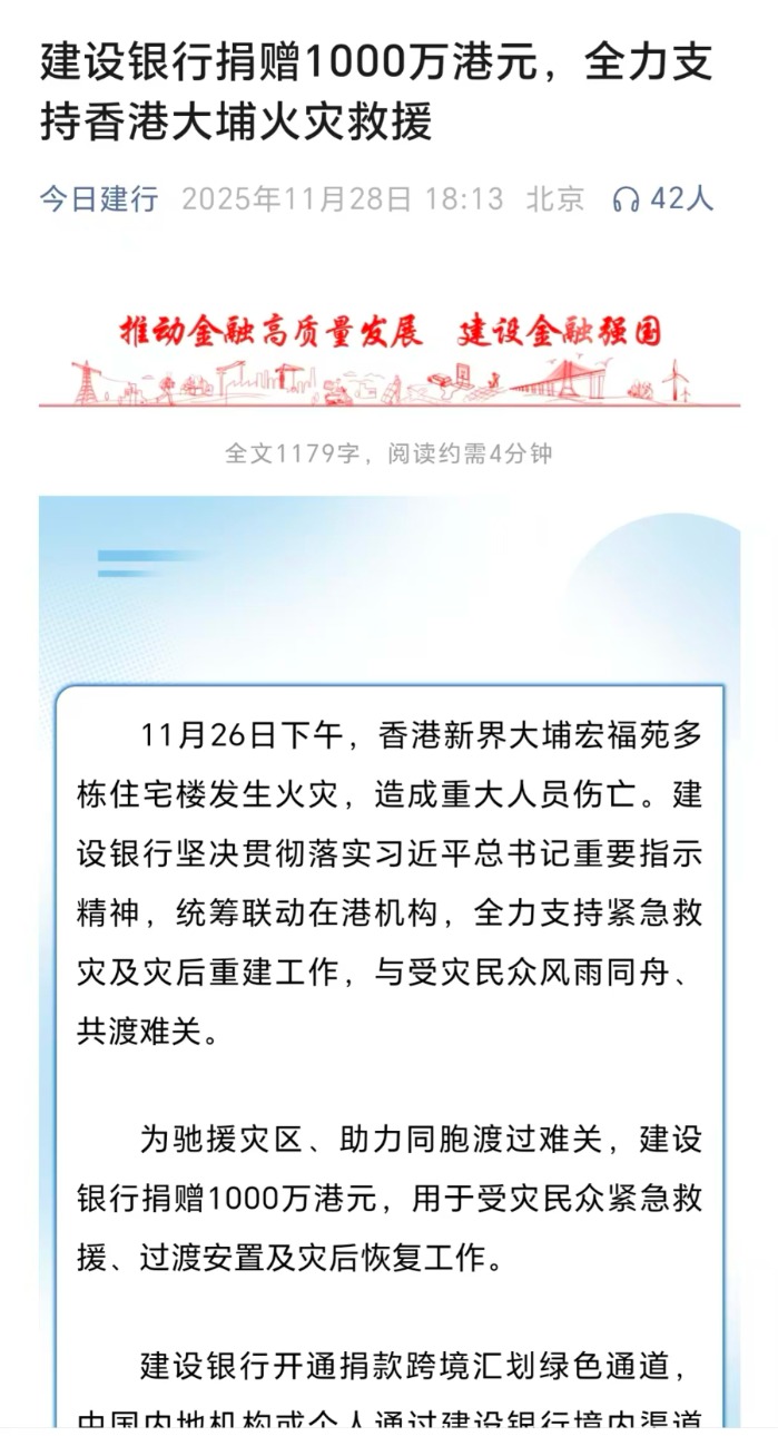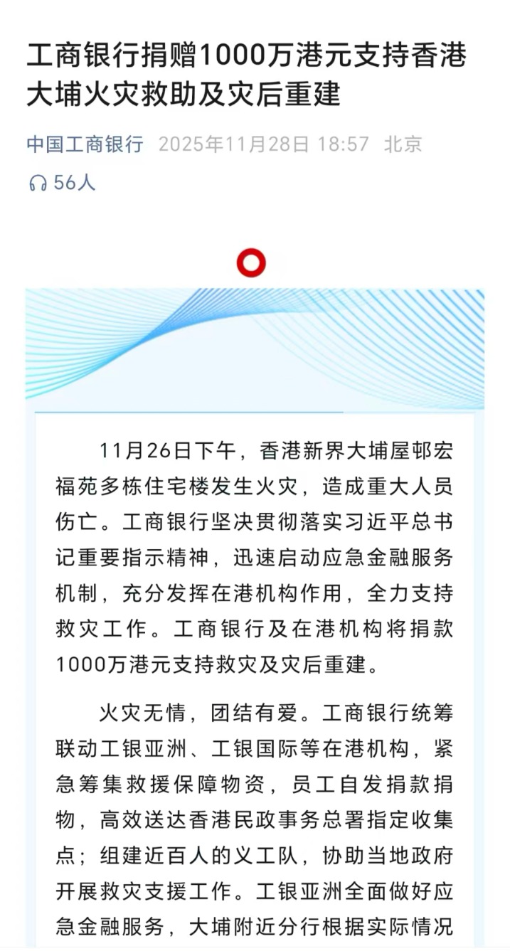 股份行方面,11月28日,浦发银行发文表示,向香港白玉兰慈善基金会捐赠1000万港元,用于支持应急救灾和灾后重建工作。香港大埔火灾发生后,浦发银行高度重视,快速启动应急响应机制,助力受灾人员渡过难关。在港机构香港分行和浦银国际第一时间组织义工团为受灾市民提供生活物资及紧急经济支持;同时,开设应急服务绿色通道,优先办理救灾资金汇划服务,确保金融服务“不断档”。