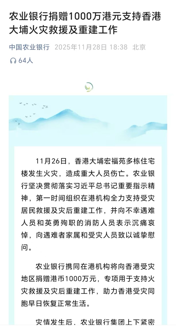 同日,农业银行发文称,携同在港机构将向香港受灾地区捐赠港币1000万元,专项用于支持火灾救援及灾后重建工作,助力香港受灾同胞早日恢复正常生活。灾情发生后,农业银行集团上下紧密联动,统筹推进各项援助措施。农行香港分行联络合作公益组织,向受灾家庭进行专项捐赠,组织义工队伍投入救灾支援;与在港保险公司保持密切沟通,明确金融支持,助力大埔火灾保险理赔;同时与香港特区政府相关房屋管理机构联系,持续关注灾后重建计划,及时提供金融支持。农银国际积极组织员工开展义务献血。农银财险第一时间启动客户出险排查,主动联系慰问受灾客户,并推出服务绿色通道、简化理赔程序、提供人文关怀等一系列服务举措,全力保障受灾民众权益。