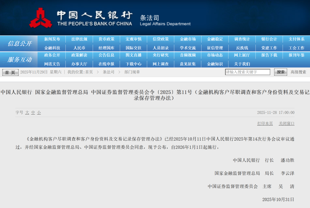 11月28日,中国人民银行官网显示,《金融机构客户尽职调查和客户身份资料及交易记录保存管理办法》(以下简称《管理办法》)已经2025年10月11日中国人民银行2025年第14次行务会议审议通过,并经国家金融监督管理总局、中国证券监督管理委员会同意,自2026年1月1日起施行。